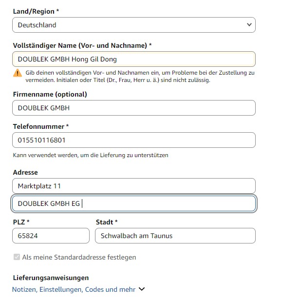 📦 DoubleK GmbH 아마존 주소 입력 가이드